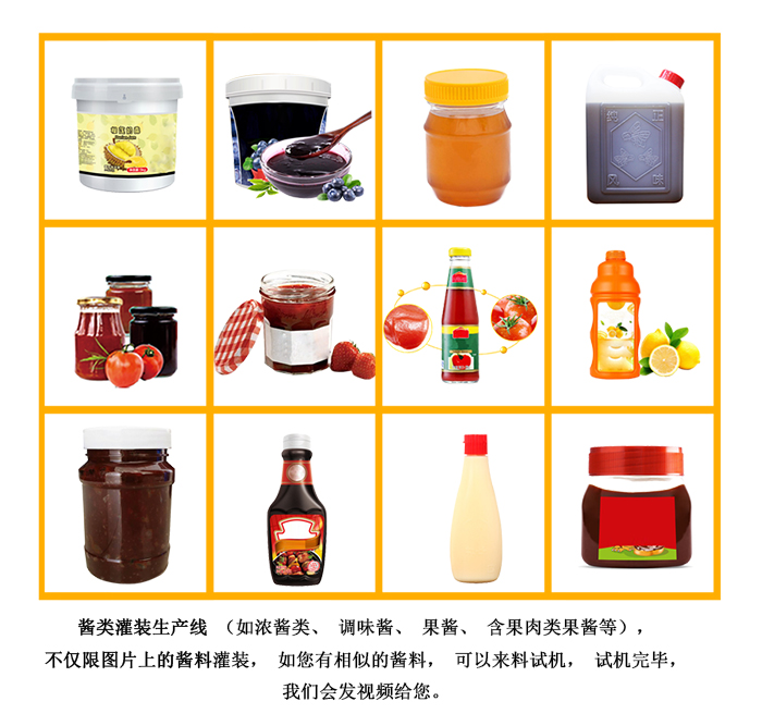 醬料灌裝機,整機采用304不銹鋼,造型大方、美觀;控制系統(tǒng)采用進口電器組件,操作簡單、方便;該醬料灌裝機還可灌裝液體、濃醬類物料,如油類、果汁、果醬等;可用于各種玻璃瓶、塑料瓶、PET罐等。