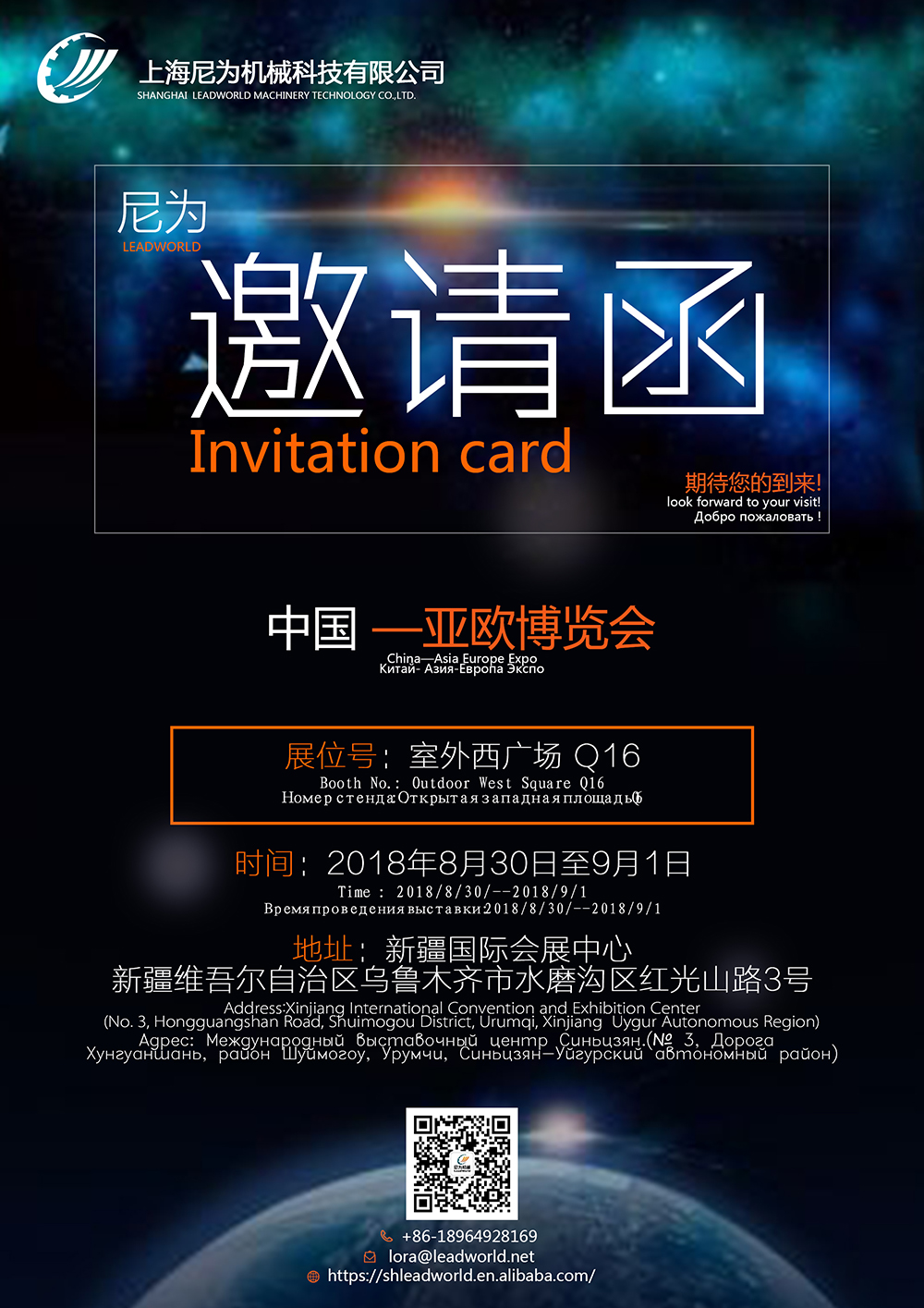 上海尼為機械科技有限公司誠意邀請您參觀將于2018年的8月30日至9月1日在新疆國際會展中心隆重舉行的中國一亞歐博覽會