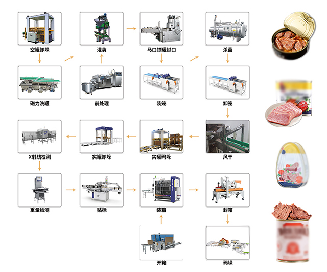 肉罐頭的生產(chǎn)工藝主要包括以下幾個步驟:原料處理、切塊、復檢、拌料、裝罐、排氣密封、殺菌冷卻、擦罐入庫。每一步都是確保產(chǎn)品質量的重要環(huán)節(jié)。
